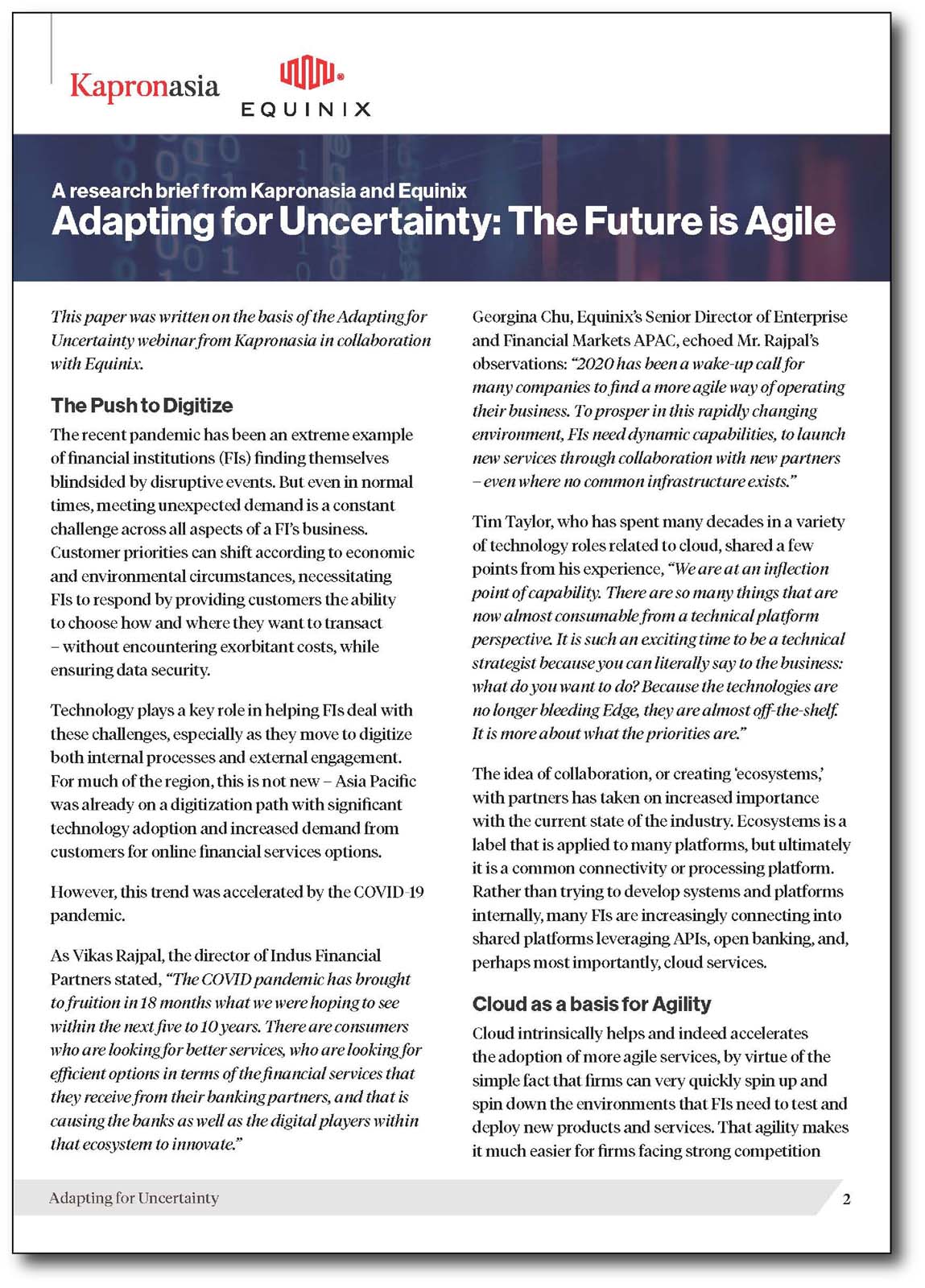 The recent pandemic has been an extreme example of financial institutions (FIs) finding themselves blindsided by disruptive events. But meeting unexpected demands is a constant across all aspects of an FI’s business. Customer priorities can also shift according to economic and environmental circumstances, necessitating FIs to respond by providing customers the ability to choose how and where they want to transact – without encountering exorbitant costs, and ensuring data security remains paramount. This paper was written on the basis of the Adapting for Uncertainty webinar from Kapronasia in collaboration with Equinix.