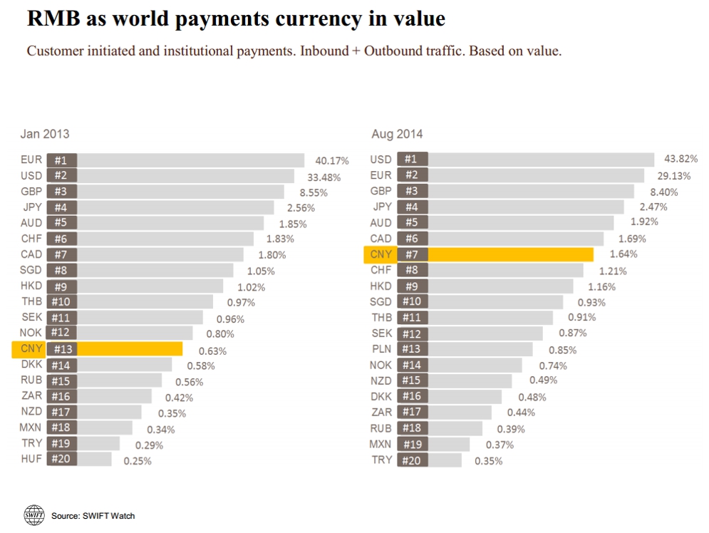 According to the latest SWIFT RMB Tracker, the number of financial institutions adopting the RMB has risen by 35% with global RMB payments tripling in value over the last two years.
