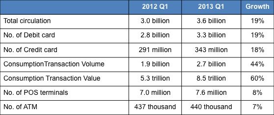 From the data released by People’s Bank of China for the first quarter 2013, the transaction volume of bankcards has reached to 100.27 trillion RMB, which is a 7.7% increase from the first quarter in 2012. The accumulated credit card issuance reached 343 million, which gives a credit card holding…