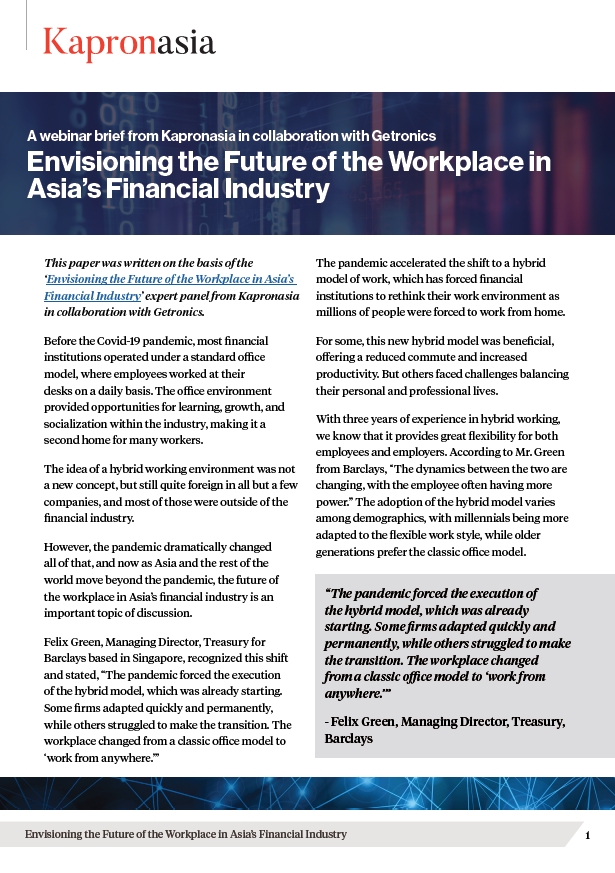 This webinar brief was written on the basis of the ‘Envisioning the Future of the Workplace in Asia’s Financial Industry’ expert panel from Kapronasia in collaboration with Getronics. A recording of the panel can also be accessed here.